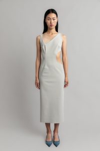 Passando al secondo look, possiamo abbinare il nostro capo chiave di oggi ad un elegante abito color sabbia. Opificio Modenese ha creato Friday Harbour, un abito midi senza maniche, con scollo asimmetrico e un taglio rotondo sul fianco sinistro. Potete indossarlo con un bel tacco oppure una sneakers che vi donerà una figura elegante e al contempo casual.