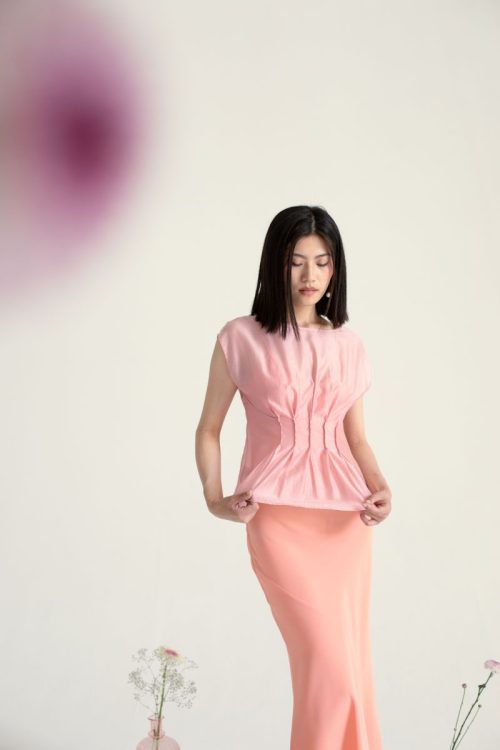 Eine raffinierte Mischung aus Materialien verbindet sich mit orientalischen Motiven und schafft Linien, die darauf ausgelegt sind, die Weiblichkeit zu unterstreichen. Die Formen kommen zur Geltung, die Silhouette spiegelt sich mit Eleganz und Charakter wider, und jedes Detail zelebriert die Schönheit des weiblichen Körpers mit zeitloser Klasse.